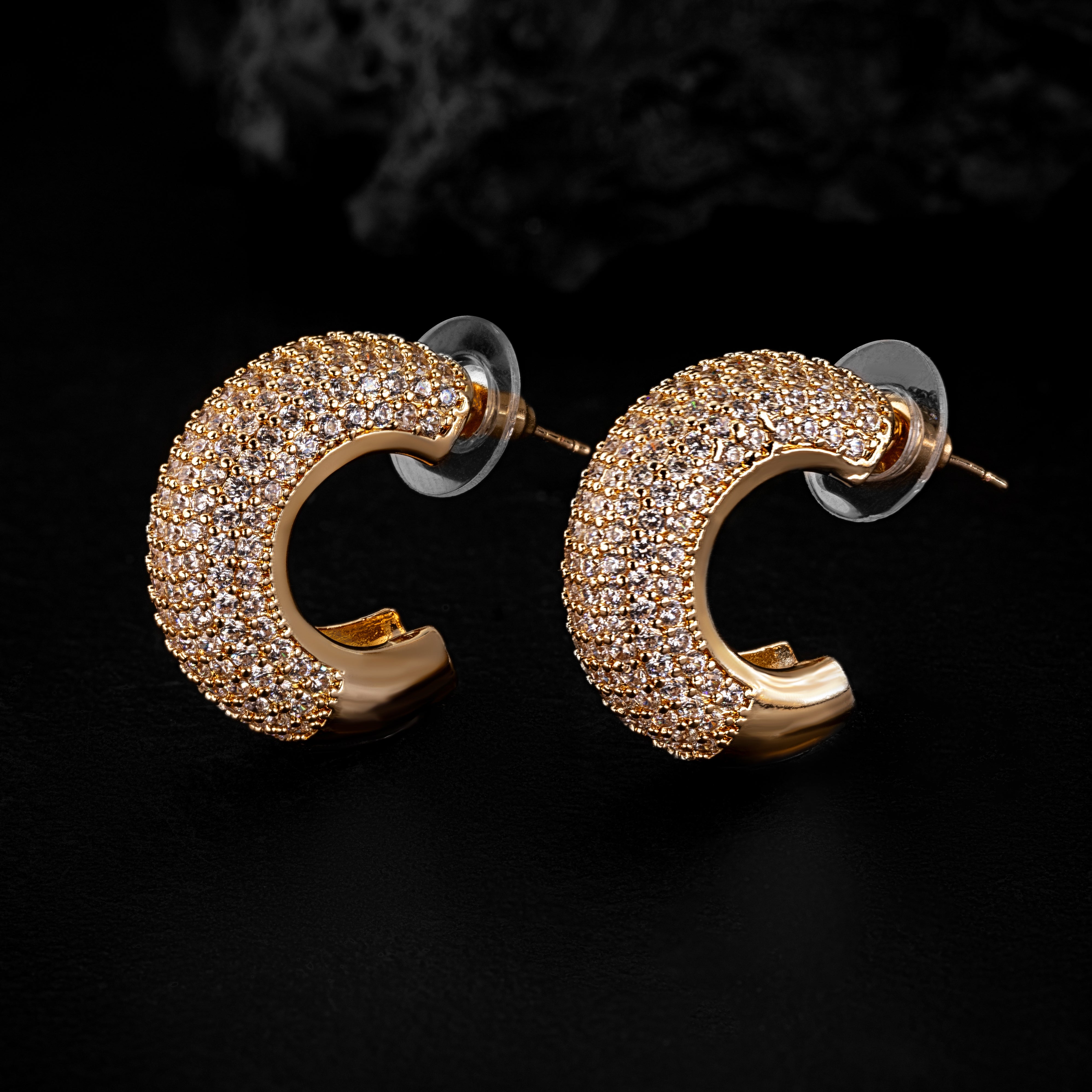 Bold yet refined, these Rhodium-plated jewellery gold-tone hoop earrings dazzle with a full pavé of sparkling stones across a thick, rounded silhouette. Designed with a secure post-back closure, they offer a luxurious finish perfect for evening wear, festive looks, or upscale styling.