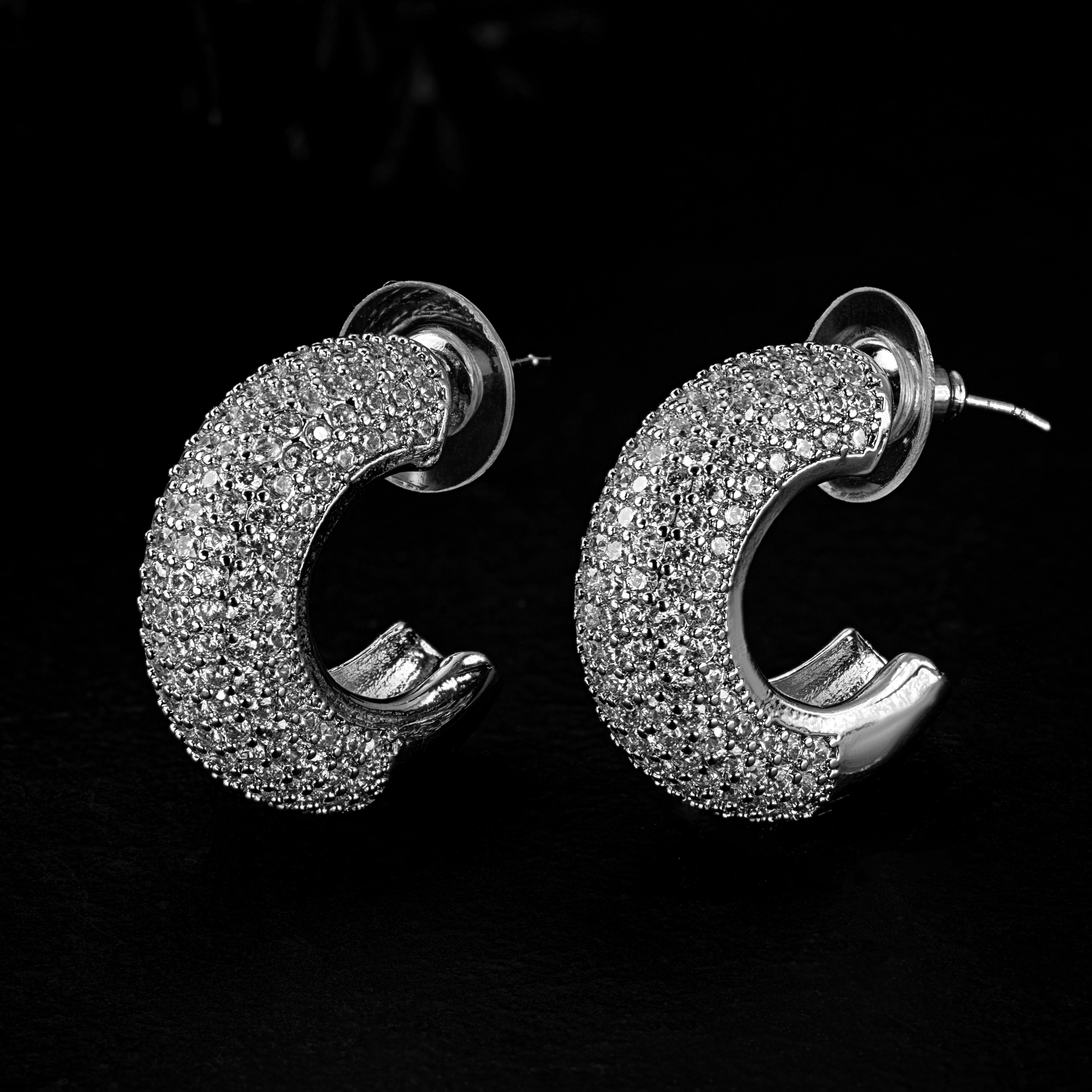 Sleek and sparkling, these Rhodium-plated jewellery semi-hoop earrings feature a dense pavé of brilliant stones across a curved gold-tone frame. With a classic post-back closure and a modern silhouette, they’re perfect for adding a touch of luxury to everyday or evening looks.