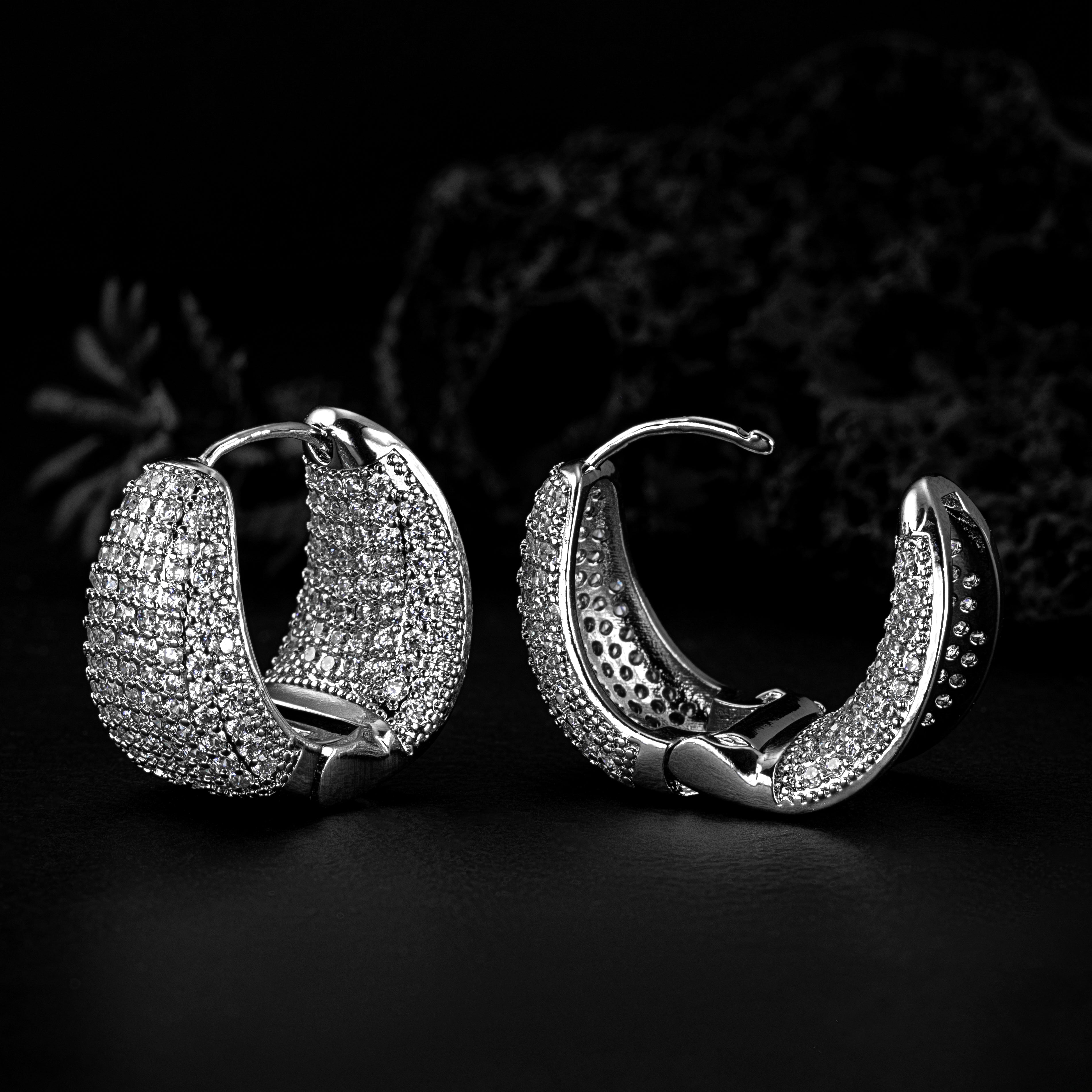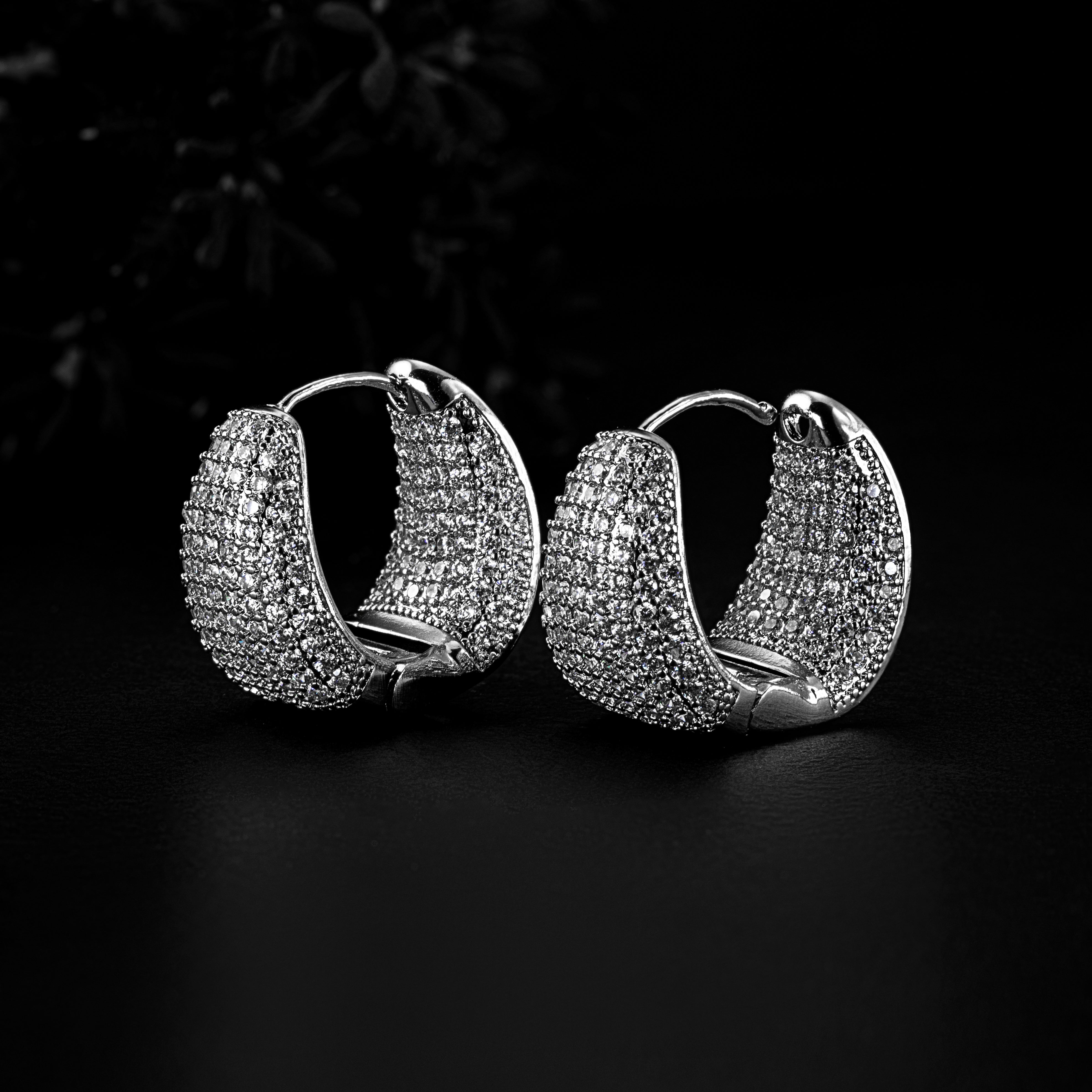 Bold and brilliant, these Rhodium-plated jewellery hoop earrings feature a sleek curved design fully encrusted with shimmering stones. Their luxurious sparkle and substantial silhouette make them a standout accessory for formal events, festive wear, or elevated everyday style.
