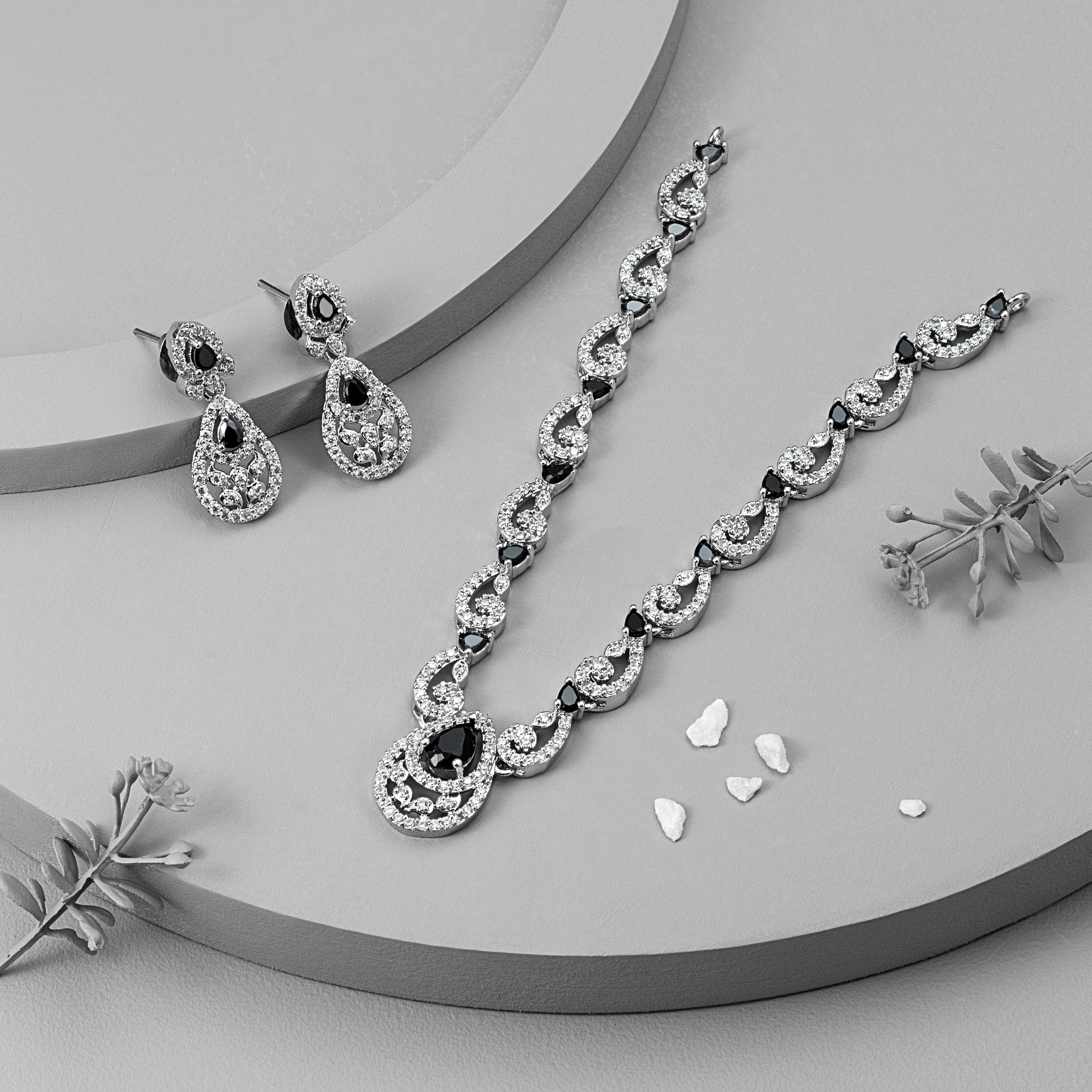 Necklace: A mesmerizing cascade of teardrop-shaped black gemstones, each embraced by a halo of dazzling clear stones. The design flows in a graceful wave, culminating in a bold centerpiece that commands attention. It’s a perfect blend of mystery and sparkle—ideal for evening glamour.