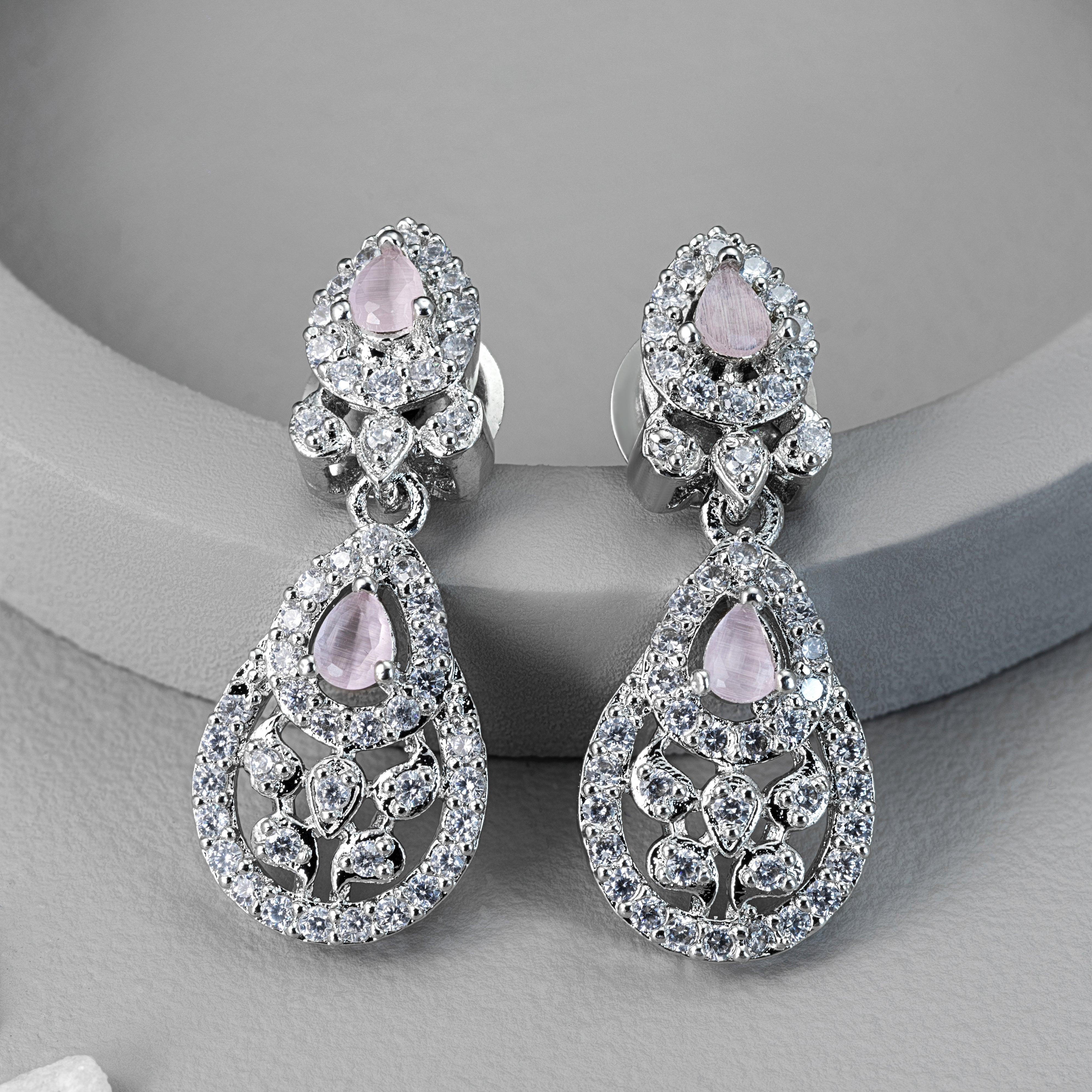 Earrings: Matching drop-style earrings echo the necklace’s romantic design. Each earring features a luminous pink teardrop gem framed in brilliance, perfect for adding a touch of sophistication to any ensemble.