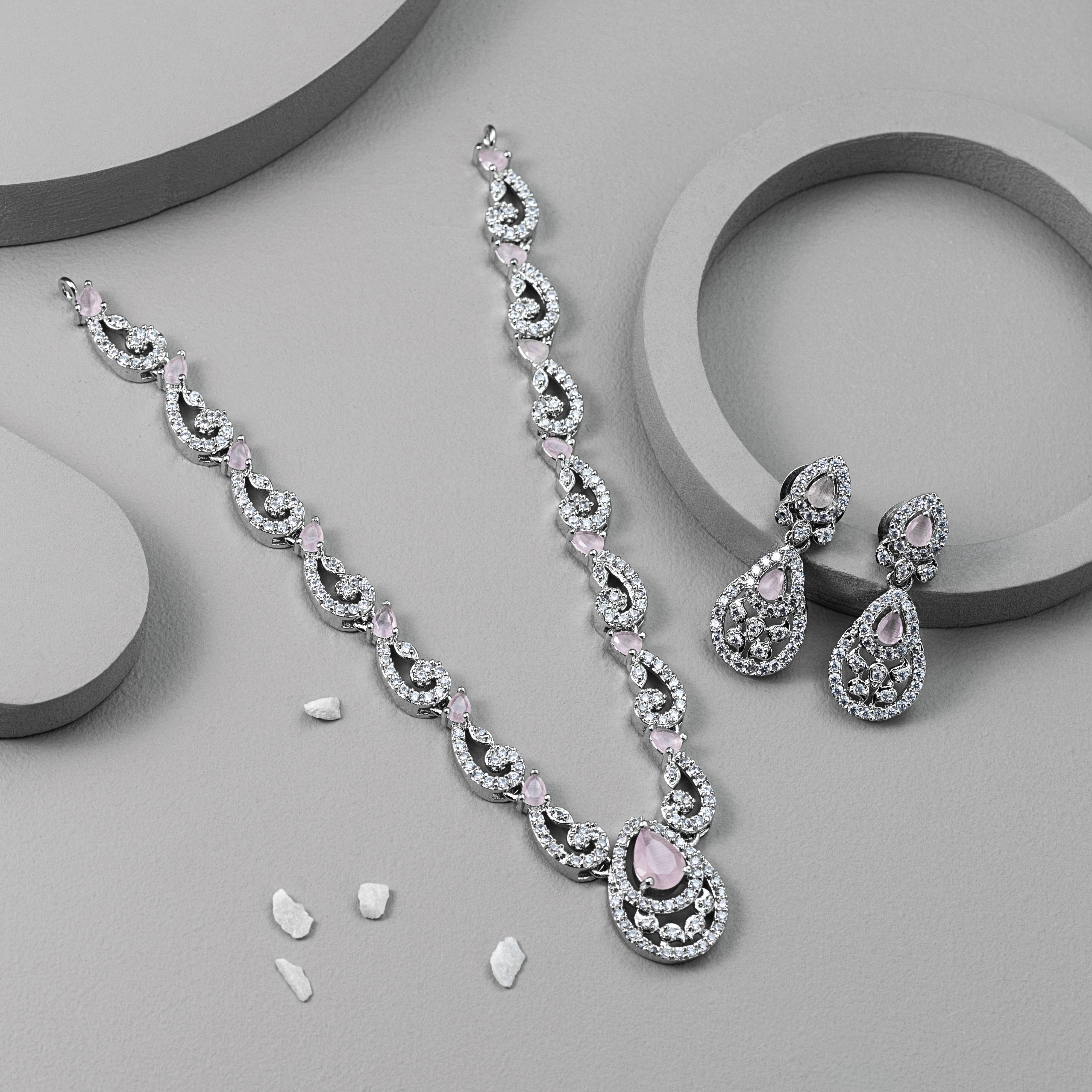 Presentation: Set against a minimalist gray backdrop with rounded platforms and scattered white accents, this Rhodium-plated jewellery set’s soft pink hues shine with understated luxury and modern finesse.
