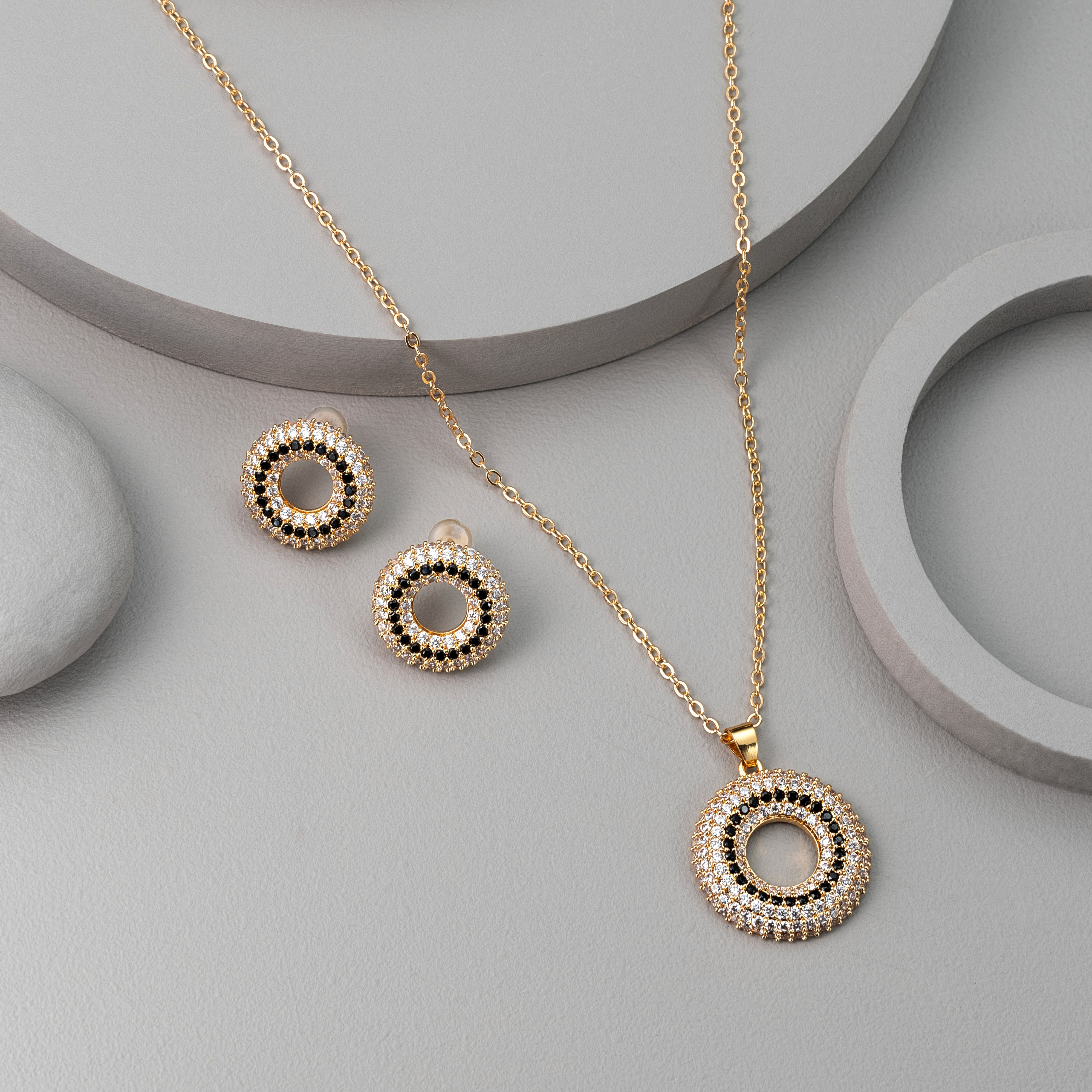 Grace meets glamour in this meticulously crafted Rhodium-plated jewellery set, featuring a radiant circular pendant and matching stud earrings. Each piece showcases a concentric design, layered with shimmering stones set in a warm gold-toned metal. The pendant, suspended from a fine chain, draws the eye with its elegant symmetry and sparkling brilliance.