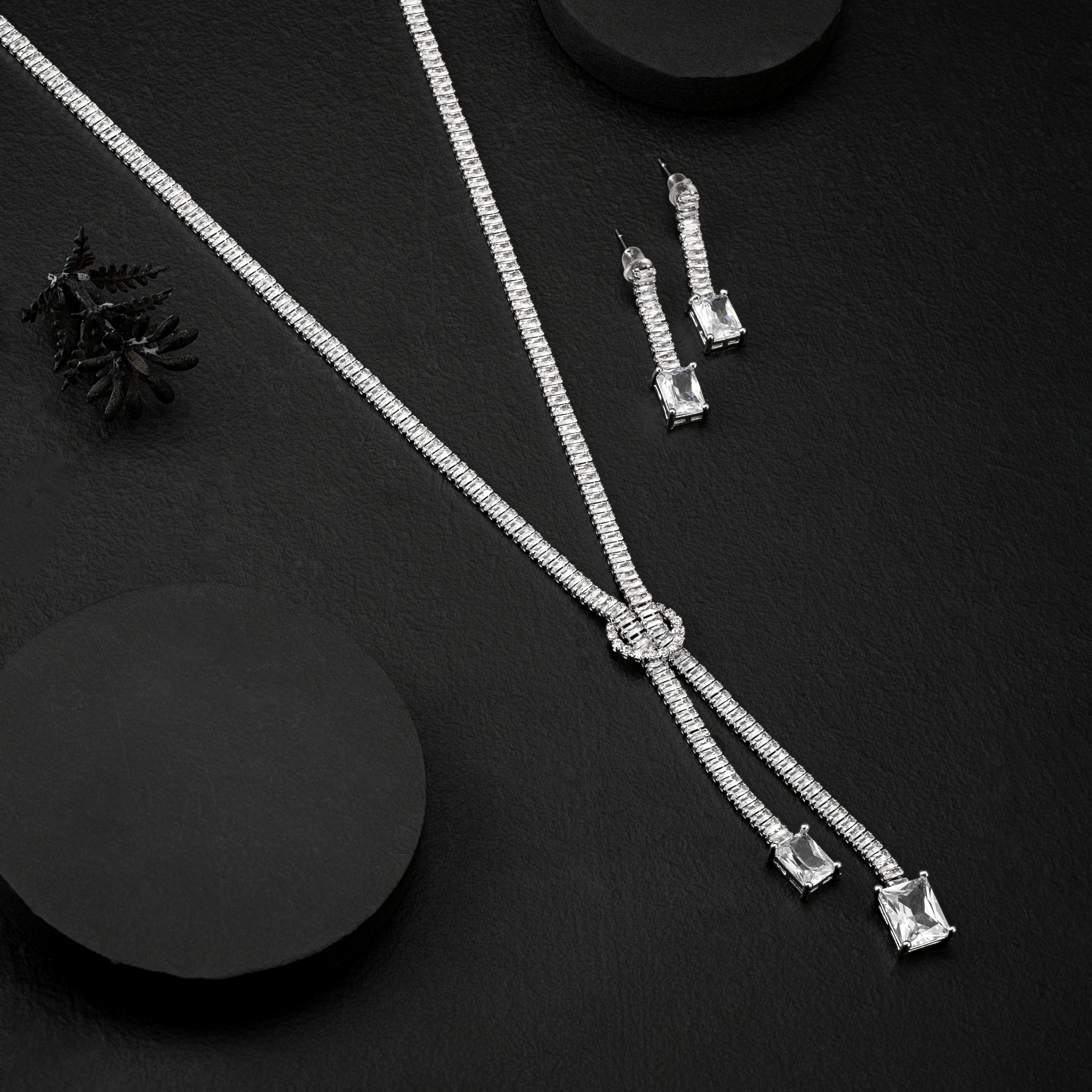 Elevate your ensemble with this exquisitely crafted Rhodium-plated jewellery set, designed to embody timeless sophistication. The necklace features a double-strand silhouette that gracefully converges into a refined knot centerpiece. From this focal point, two sleek strands cascade downward, each adorned with a radiant, rectangular-cut clear gemstone that captures and reflects light with stunning brilliance.
