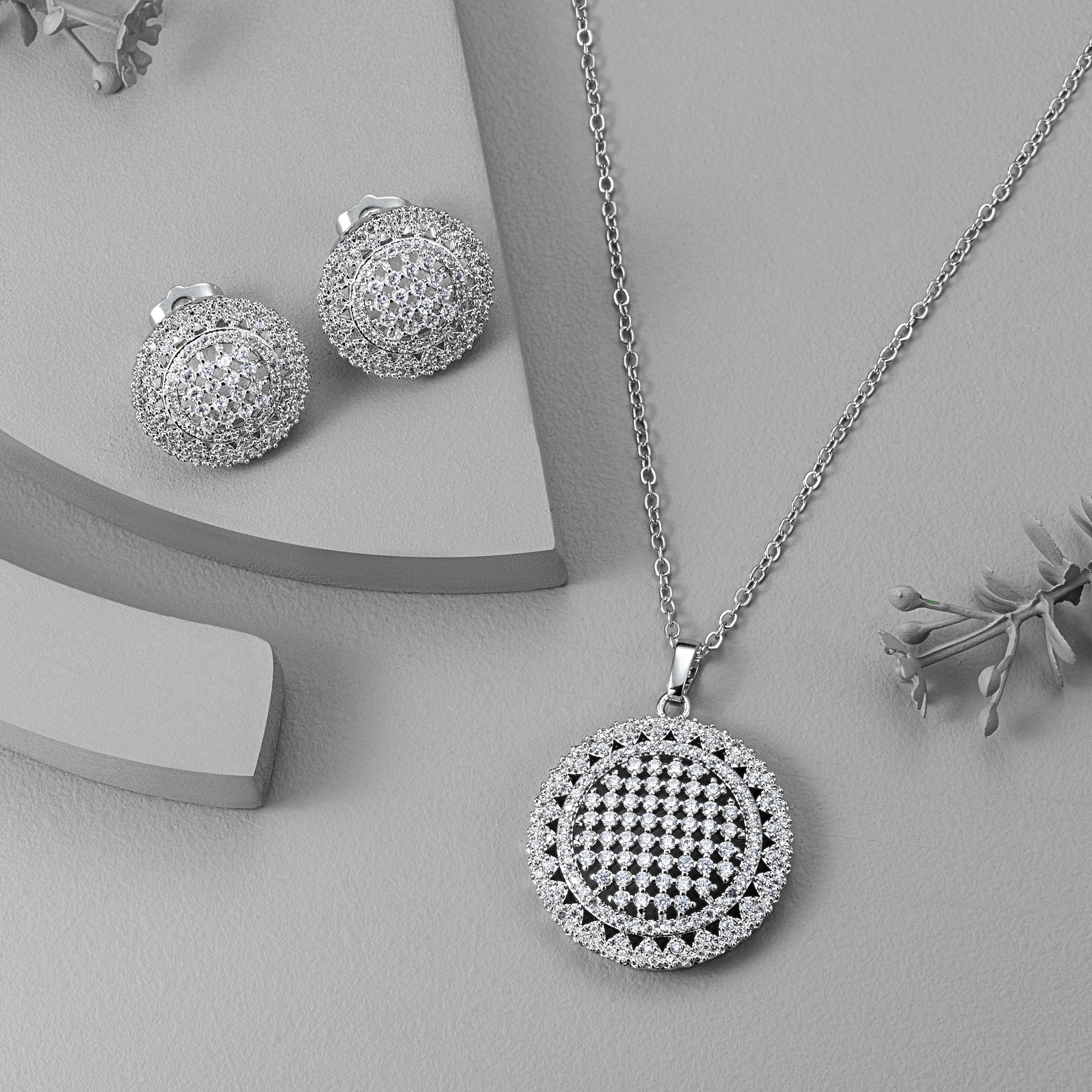 Crafted to captivate, this exquisite jewelry set features a round pendant necklace and matching stud earrings, each adorned with intricate concentric layers of sparkling stones. The design showcases a masterful arrangement of brilliance, creating a textured dome effect that reflects light from every angle.