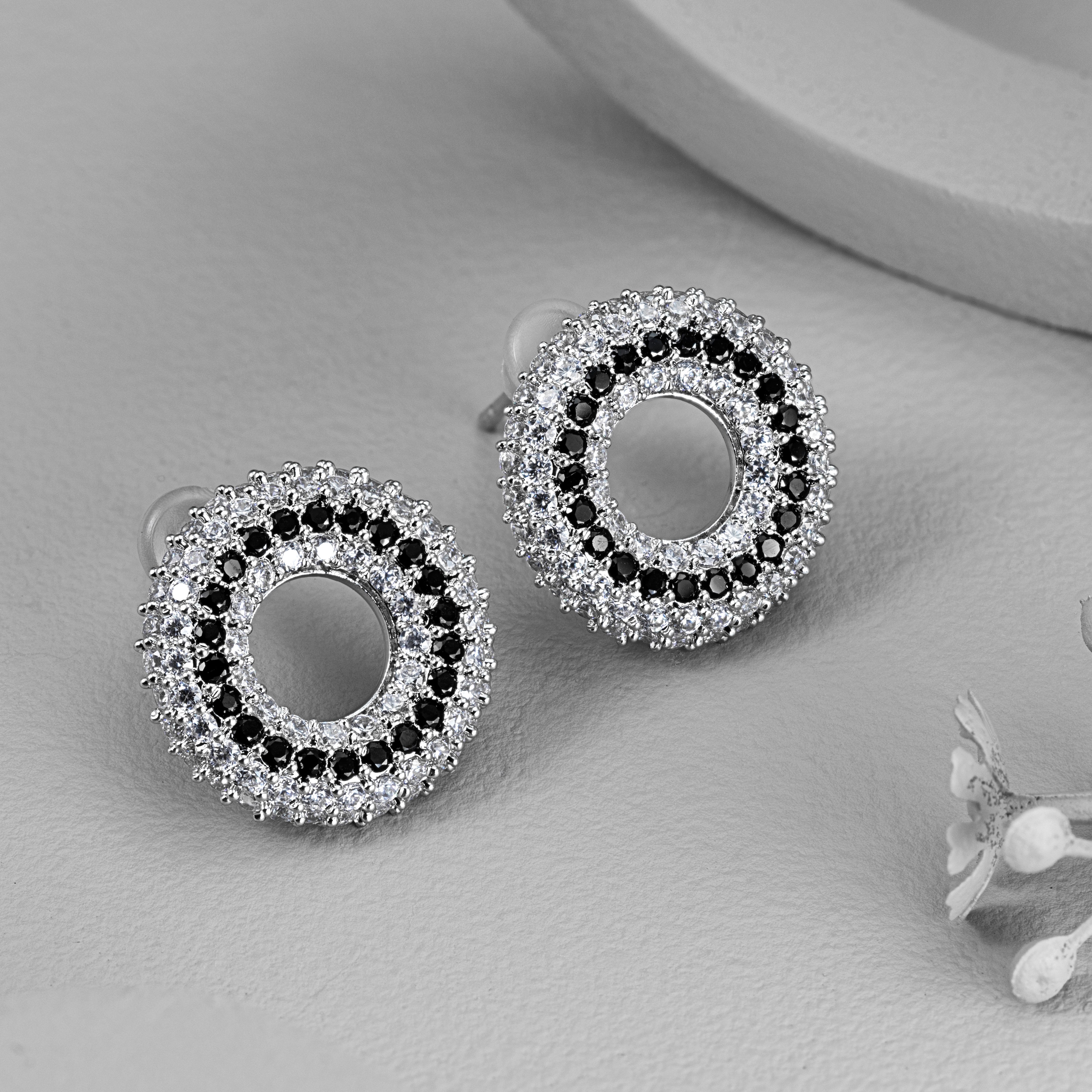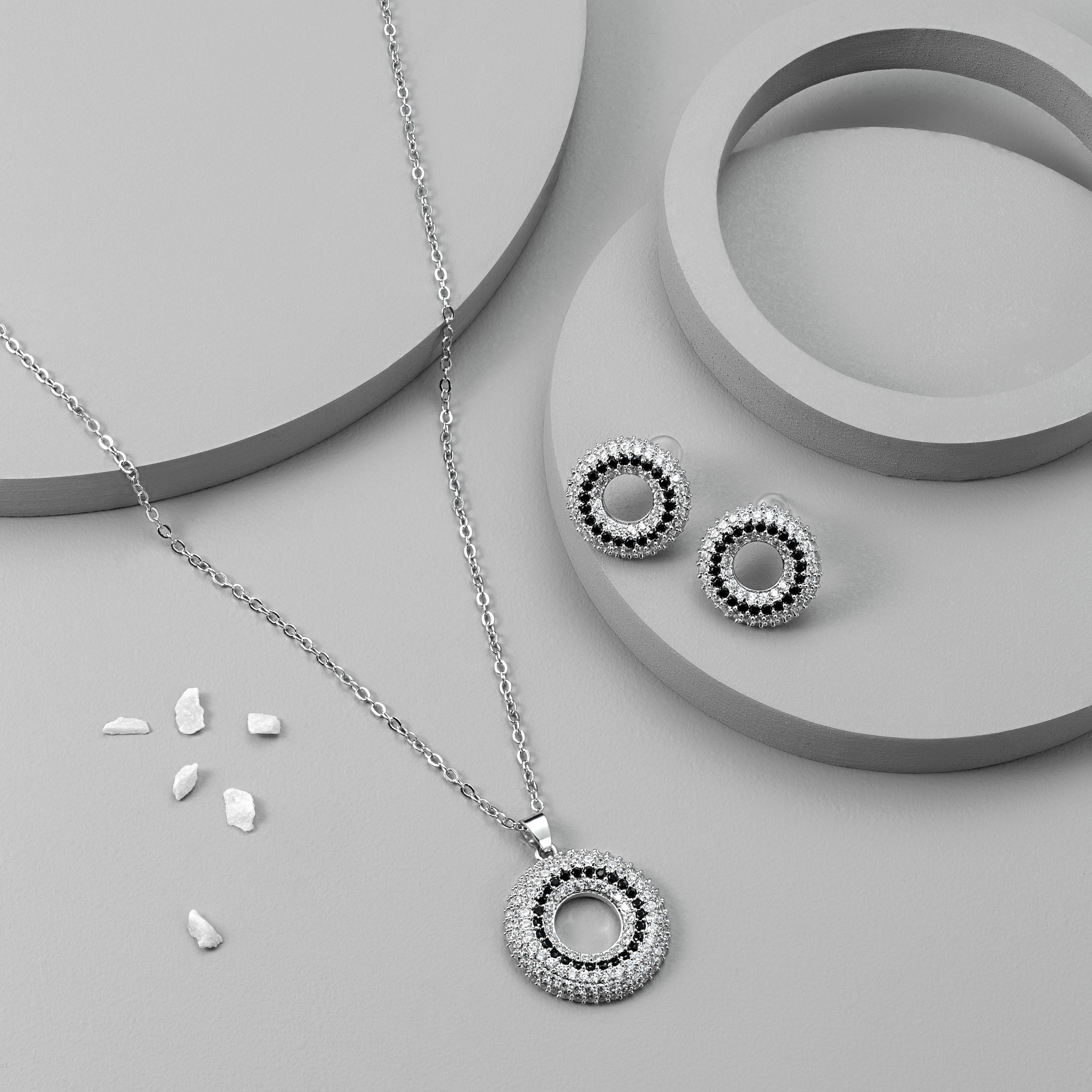 Refined and radiant, this Rhodium-plated jewellery set is a celebration of symmetry and sparkle. The necklace features a delicate silver-toned chain that holds a striking concentric pendant. Designed with precision, the pendant showcases multiple rows of shimmering stones encircling a central hollow, creating a captivating play of light and texture.