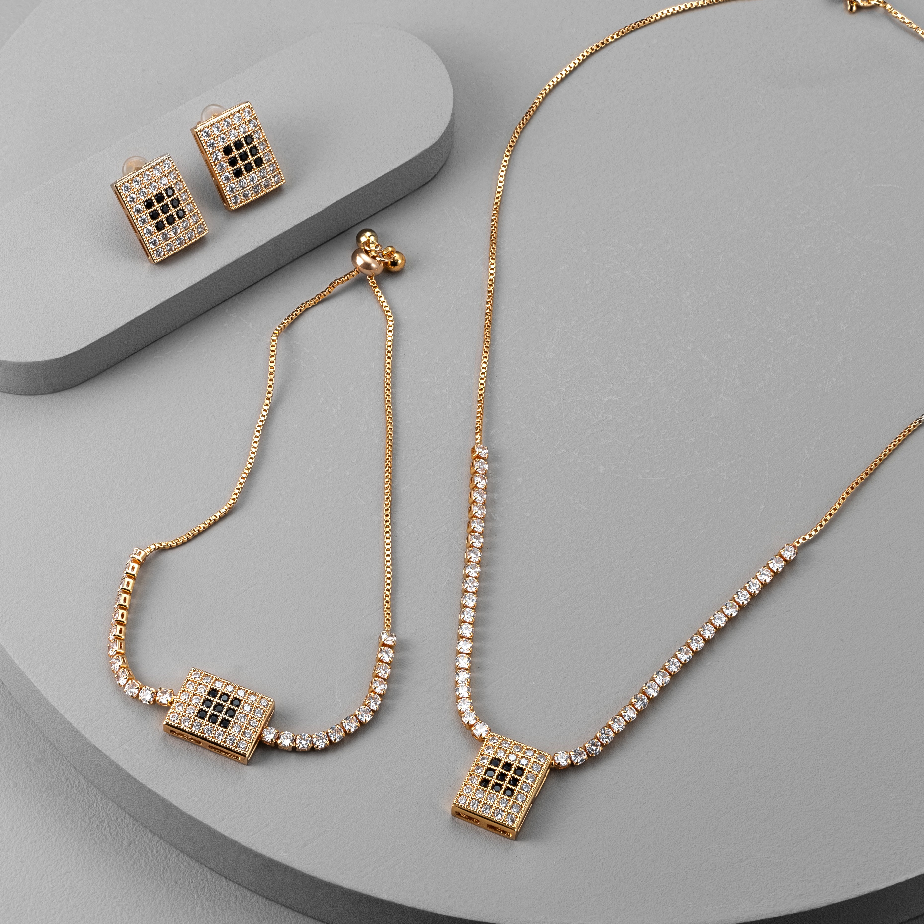 This sophisticated Rhodium-plated jewellery set features a striking combination of gold-tone metal and contrasting black and clear stones, designed to make a bold yet elegant statement. The set includes a necklace, bracelet, and earrings, each showcasing a square-shaped pendant with a grid of black stones framed by brilliant clear accents.