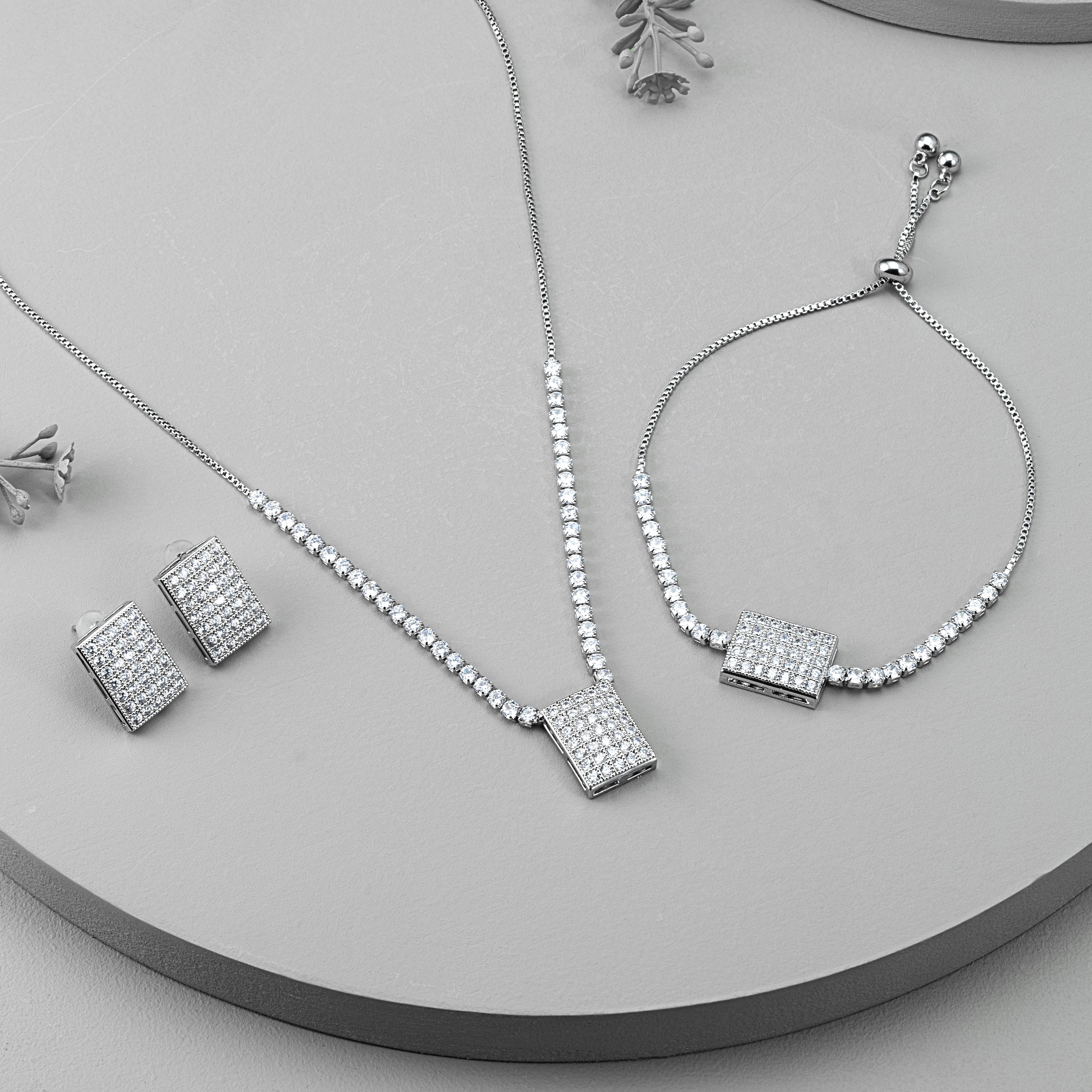 This exquisite Rhodium-plated jewellery set showcases timeless elegance and refined craftsmanship. Featuring a coordinated trio of rectangular-shaped pieces—necklace, bracelet, and earrings—each item is meticulously adorned with brilliant-cut stones that deliver exceptional sparkle and sophistication.